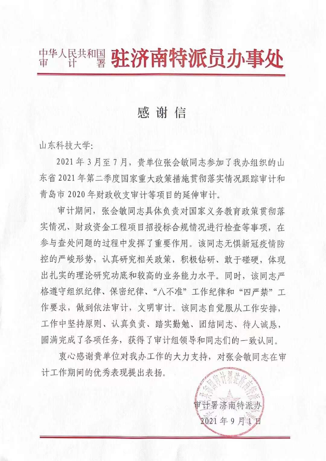2021年3月受校委派TapTap点点张会敏同志到审计署驻济南特派办进行为期5个月的协助审计工作。工作期间,张会敏同志吃苦耐劳,勤学苦干,认真负责,圆满完成了各项审计任务,赢得了驻济特派办领导和同志们的一致好评,9月1日,驻济特派办给学校发来感谢信,对张会敏同志参加济南特派办组织实施的山东省2021年第二季度国家重大政策措施贯彻落实情况跟踪审计和青岛市2020年财政收支审计等项目延伸审计的出色表现表示感谢。