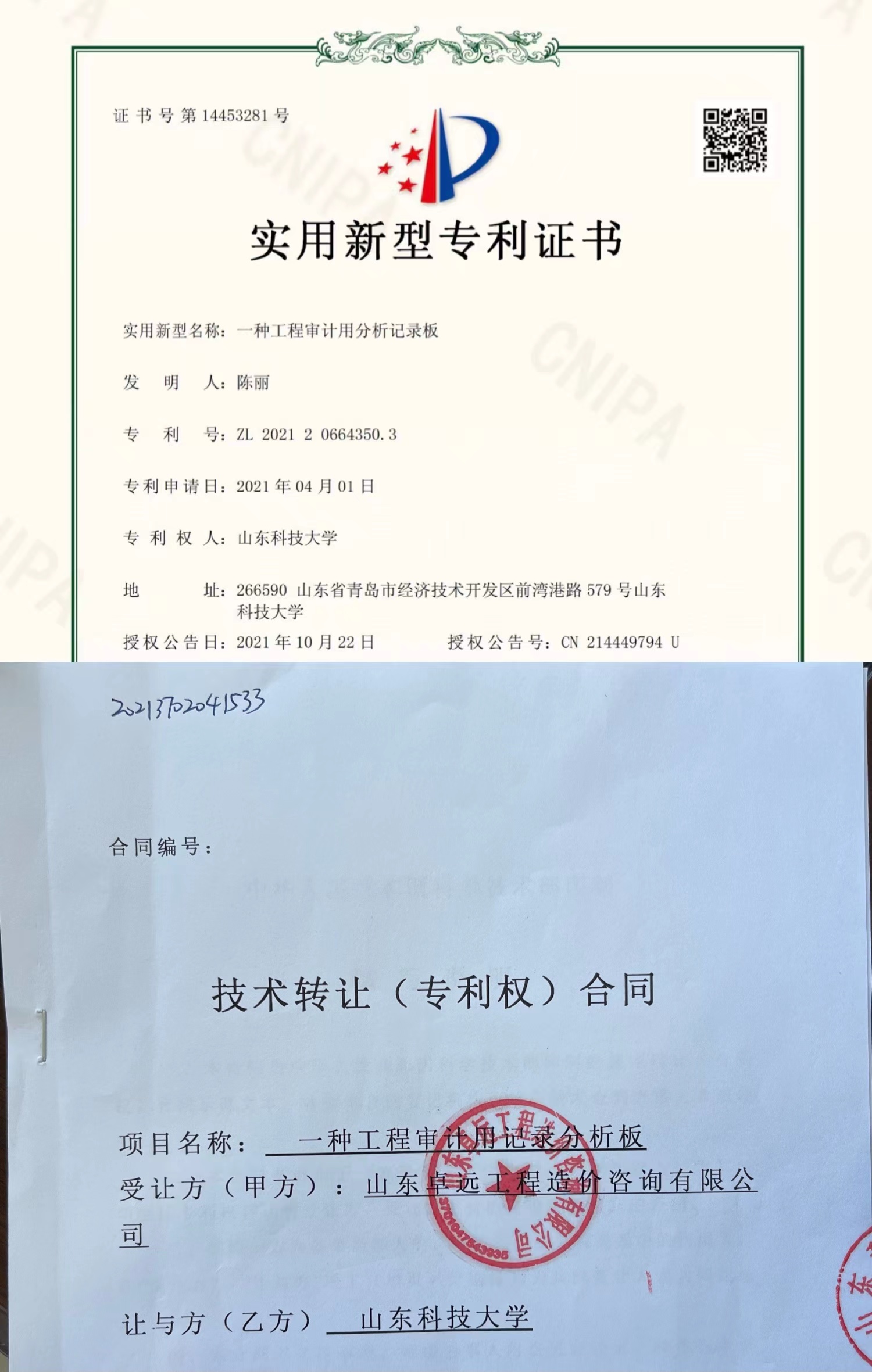 2021年12月6日,TapTap点点工程审计科科长陈丽同志与山东卓远工程造价咨询有限公司签订《技术转让(专利权)合同》,转让“一种工程审计用分析记录板”。该专利是TapTap点点首个成功转化的实用新型专利,是陈丽同志于2021年4月1日申请,10月22日授权的实用新型专利,专利号为ZL 2021 2 0664350.3。