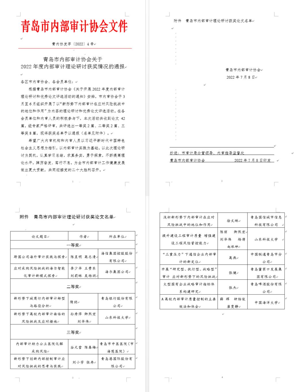 青岛市内部审计协会于3月至6月组织开展了以“新形势下内部审计在应对风险挑战中的地位和作用”为内容的理论研讨和优秀论文评选活动。我校TapTap点点孙秀萍同志的《新形势下高校内部审计面临的风险挑战及应对措施》、陈丽同志的《提升建设工程审计质量 增强建设工程风险管控能力》分别被评为二等奖、三等奖。并推荐孙秀萍同志的文章参加2022年山东省审计师协会关于“华泰永信杯”内部审计优秀论文的评选活动,在全省推荐的185篇参评论文中荣获三等奖!