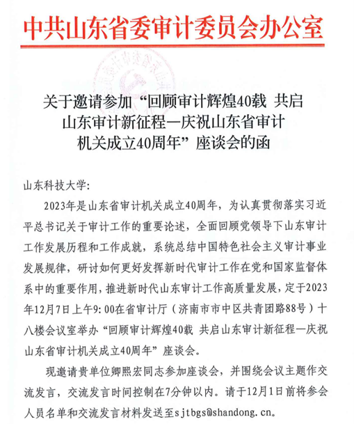 12月7日,我校应邀参加山东省审计机关成立40周年座谈会,并围绕会议主题作交流发言。座谈会坚持以习近平新时代中国特色社会主义思想为指导,深入贯彻党的二十大精神,锚定“走在前、开新局”,围绕“回顾审计辉煌40载 共启山东审计新征程”主题,深情回顾审计成长的光辉历程,深刻总结审计工作的发展规律,深度展望审计事业的美好前景,进一步凝聚推动新时代新征程山东审计事业高质量发展的政治共识、思想共识和行动共识。省审计厅党组书记、厅长张晓峰出席会议并讲话,省委审计委员会成员单位负责同志及联络员,特约审计员、内部审计人员和离退休审计干部代表受邀参加会议。