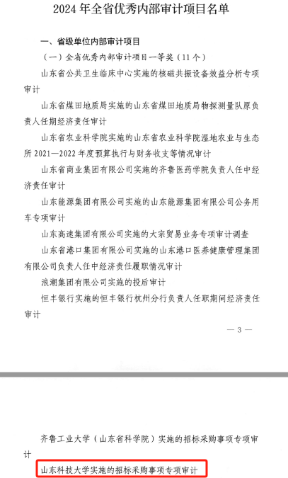 另外,在2024年10月21日山东省审计厅组织的“全省内部审计工作推进会”上,全省共有17家单位的经验交流材料被编入《全省内部审计工作推进会议经验交流材料汇编》,我校作为唯一高校,内部审计经验交流材料被编入该材料汇编。