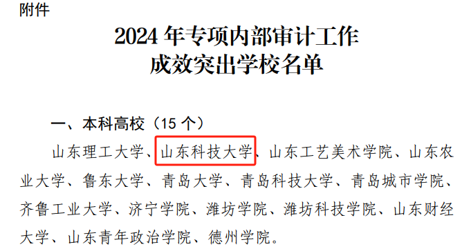 为了检验全省2024年度专项内部审计成效,山东省教育厅于2024年11月27日-28日在潍坊举办了各高校2024年专项内部审计成果展示评比活动,共有140余所省属高校参评,通过现场展示、观摩交流、专家点评以及高校互评四个环节,对各高校专项审计组织流程、审计发现问题、整改情况以及学校有关部门参与情况、内审部门作用发挥情况等进行了综合评价,在展评现场,我校所展示的材料收到参评高校和专家一致好评。近日,省教育厅对本年度专项审计工作成效比较突出15 所本科高校、17 所高职院校发文予以通报表扬,我校获此殊荣。